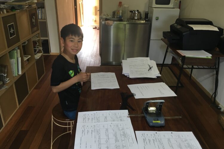 今日は着工前の段取りなど、事務作業に追われる状態でした。 夕方に息子(新5年生)が事務所に来ました。 書類の穴あけや、紐綴じ作業! 猫の手じゃ無いですが、……