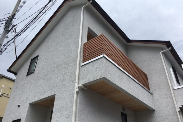 本日は、建築基準法の完了検査を受けました。 是正も無く、無事合格です! 外部足場が解体され、建物の外観が姿を現しました(^_^) バルコニーの木製……