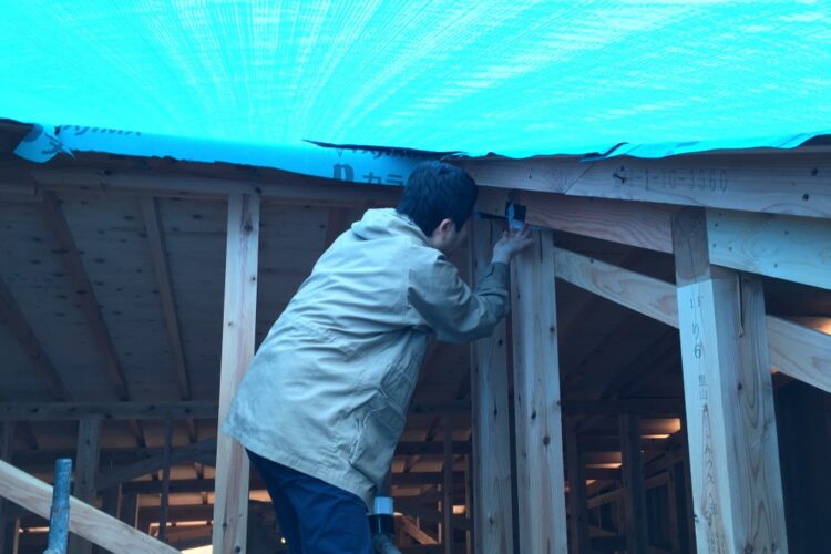 本日も引き続き大工工事です。 外部の面材が施工されています。 釘のピッチや釘の長さ、釘のめり込みを確認しました。 釘のピッチは外通り@100mm以下なので問題な……