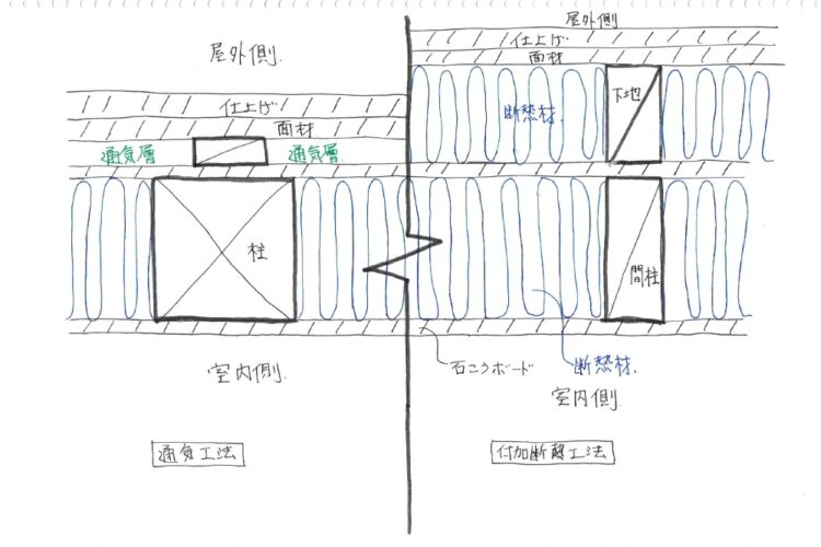 工藤住環境設計室の工藤です。 今回は木造住宅の通気工法と付加断熱工法についてお話したいと思います。 先ず、通気工法とは木造住宅の外壁に空気が流れる様にし、湿気を……