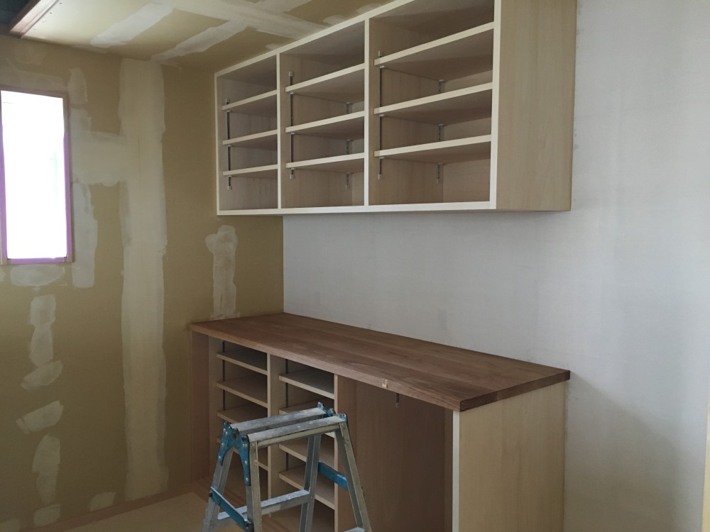 カウンターの下にも小さな棚板を設置しているので、ここにも小物等を置けます。