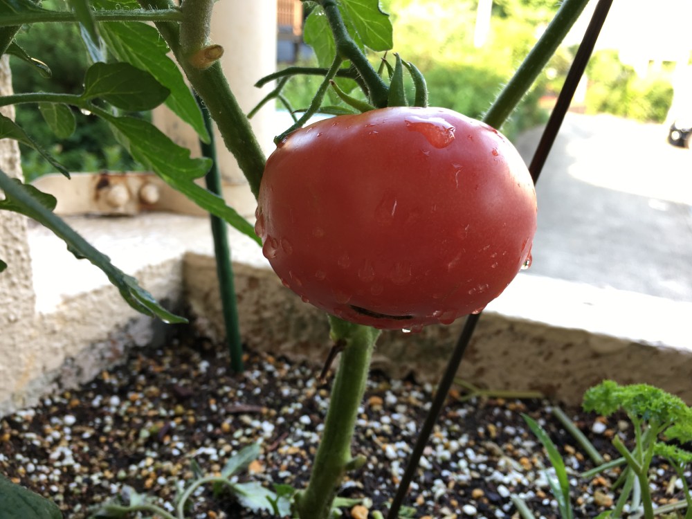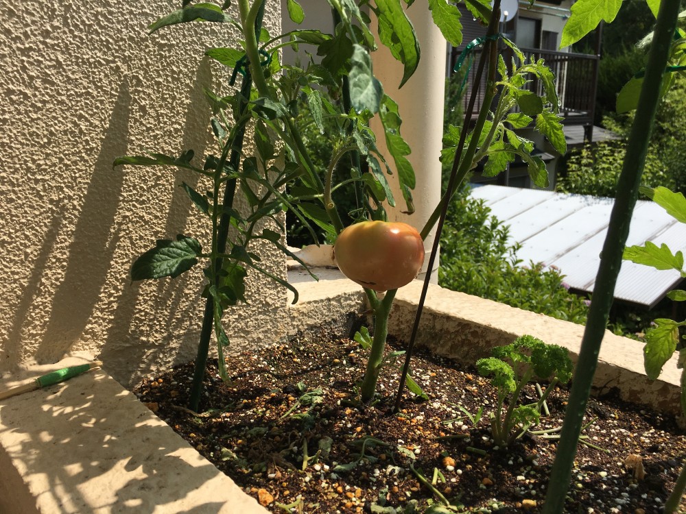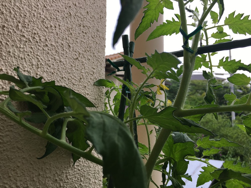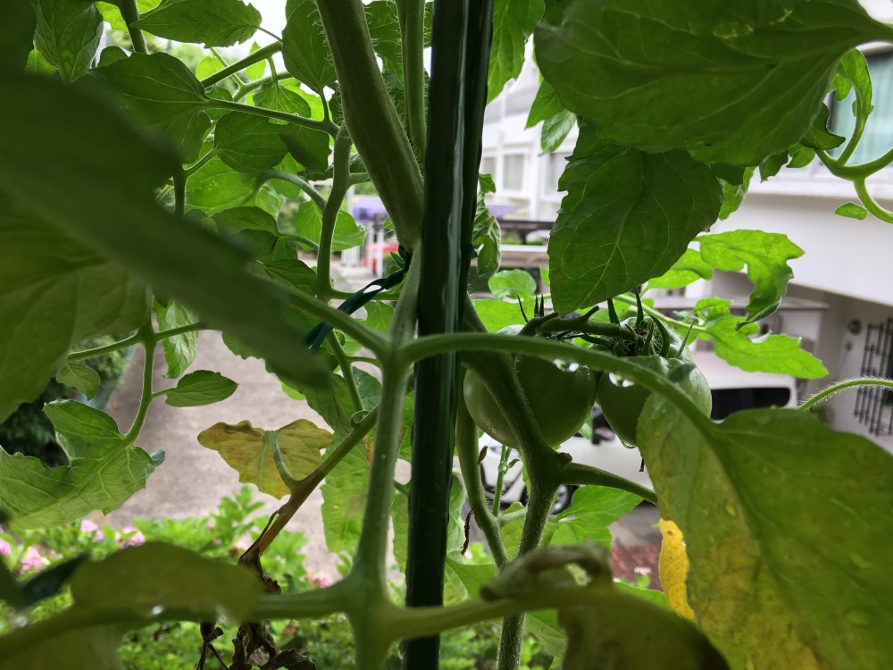 真ん中のトマトが色付き始めたので、久しぶりに写真を撮ることに。
