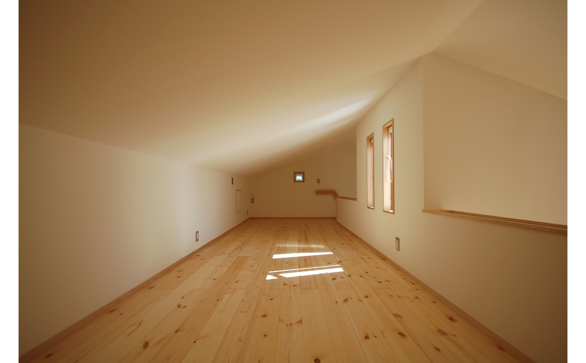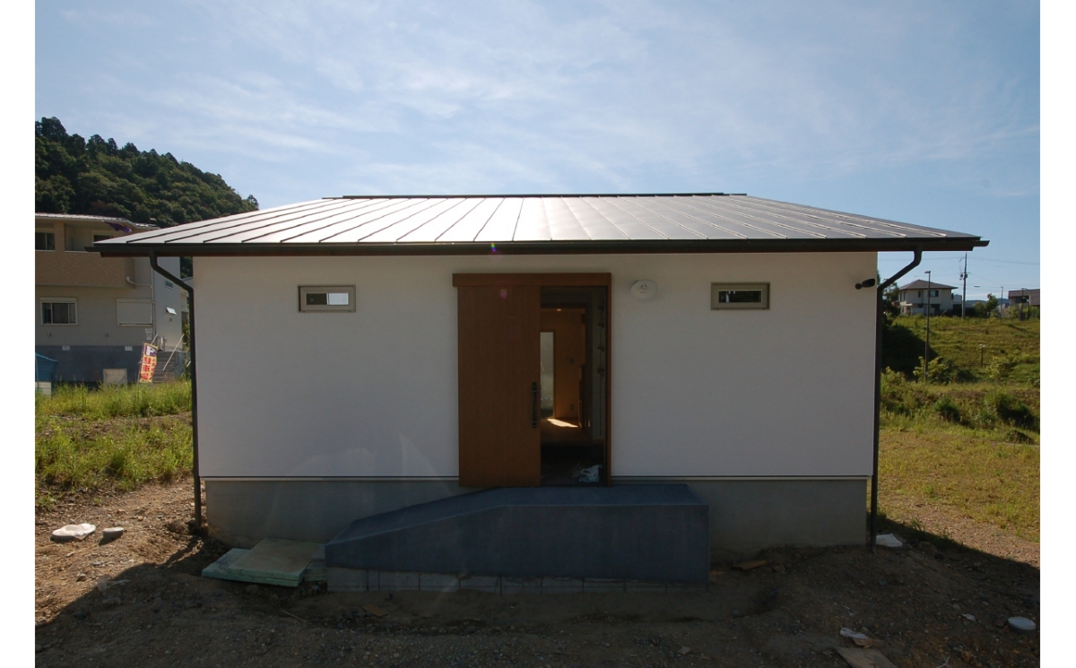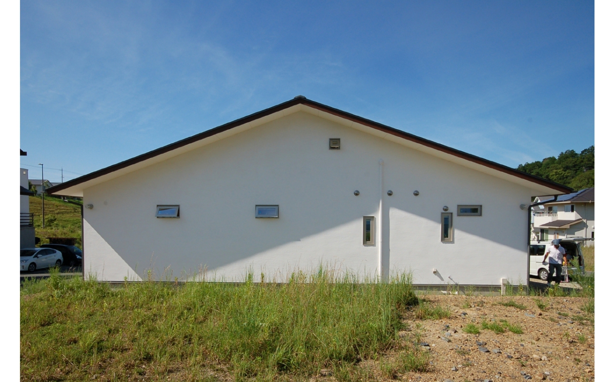 薄い軒が深く、建物の高さを抑え、周辺の里山風景に溶け込むフォルムが特徴です。