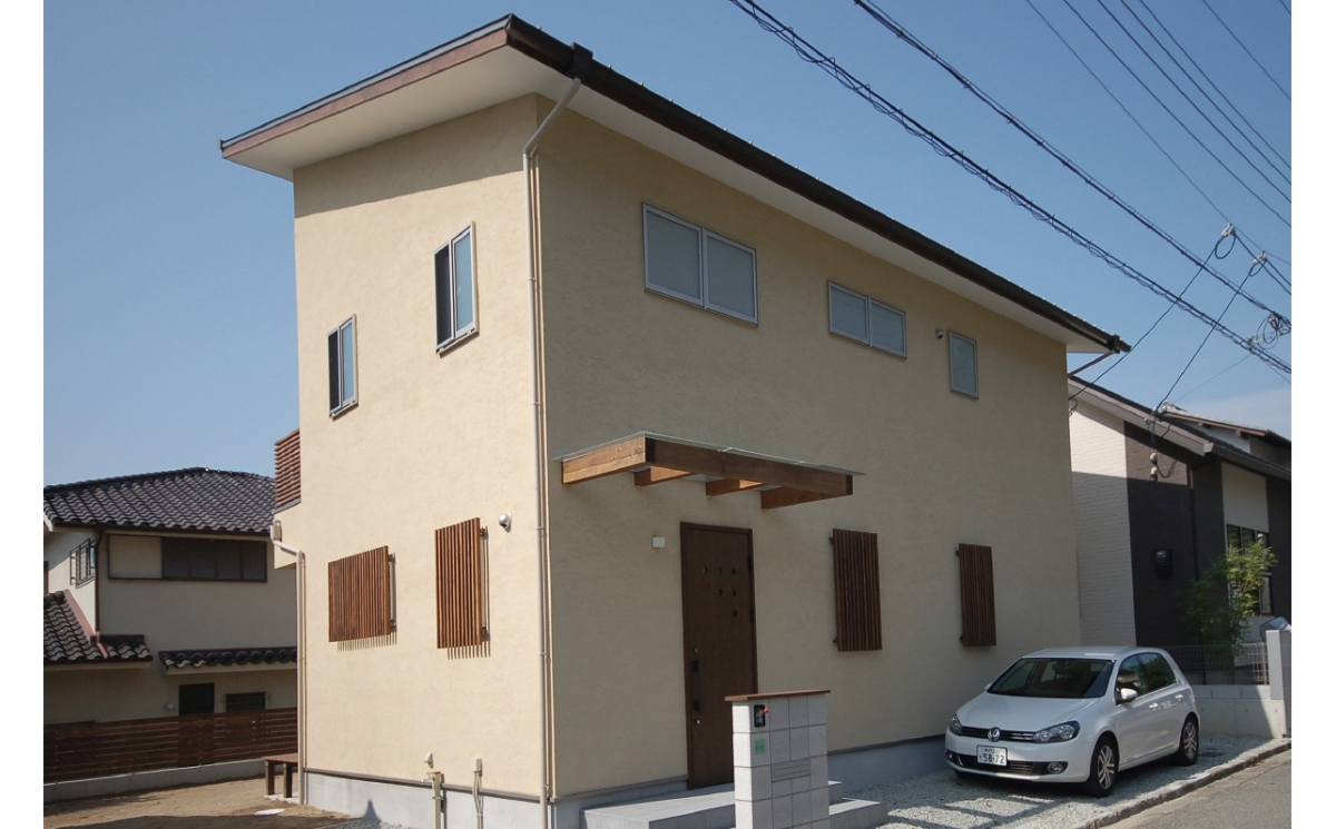 外観のデザインは屋根の軒を大きく出すことによって雨から外壁・建物を守り、耐久性向上を図りました。全体的にシンプルで飽きのこないデザインを心がけて設計を行いました。