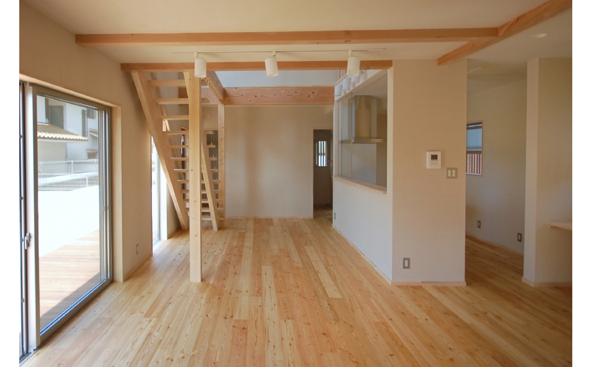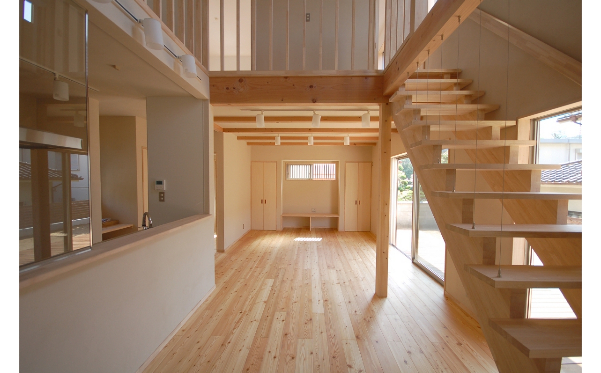 宝塚市中山台に建つこの建物は、リビング部分の南面に大きな吹き抜けを設けることによって、採光・日射熱を十分に取得することが出来る計画としました。