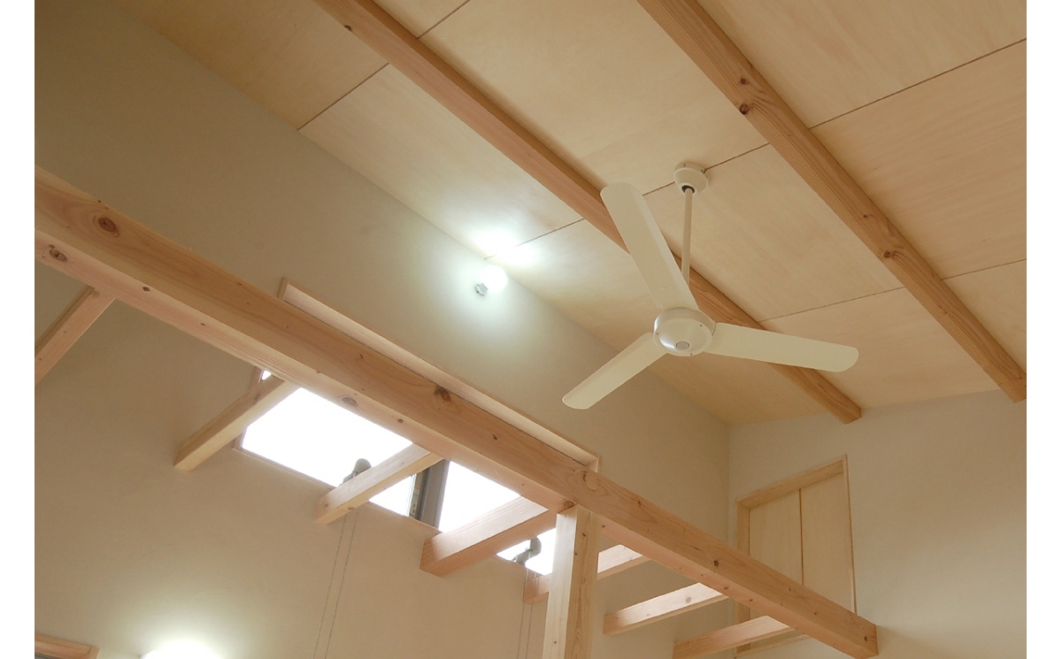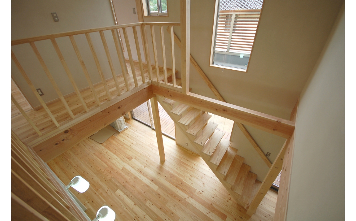 リビングと、この吹き抜けを介して2階にあるデスクコーナーとタテにつなぎ、家族のコニュニケーションに配慮した計画としました。