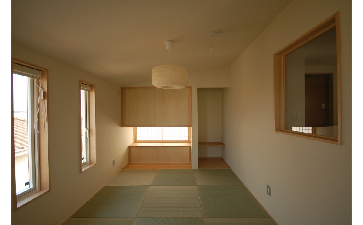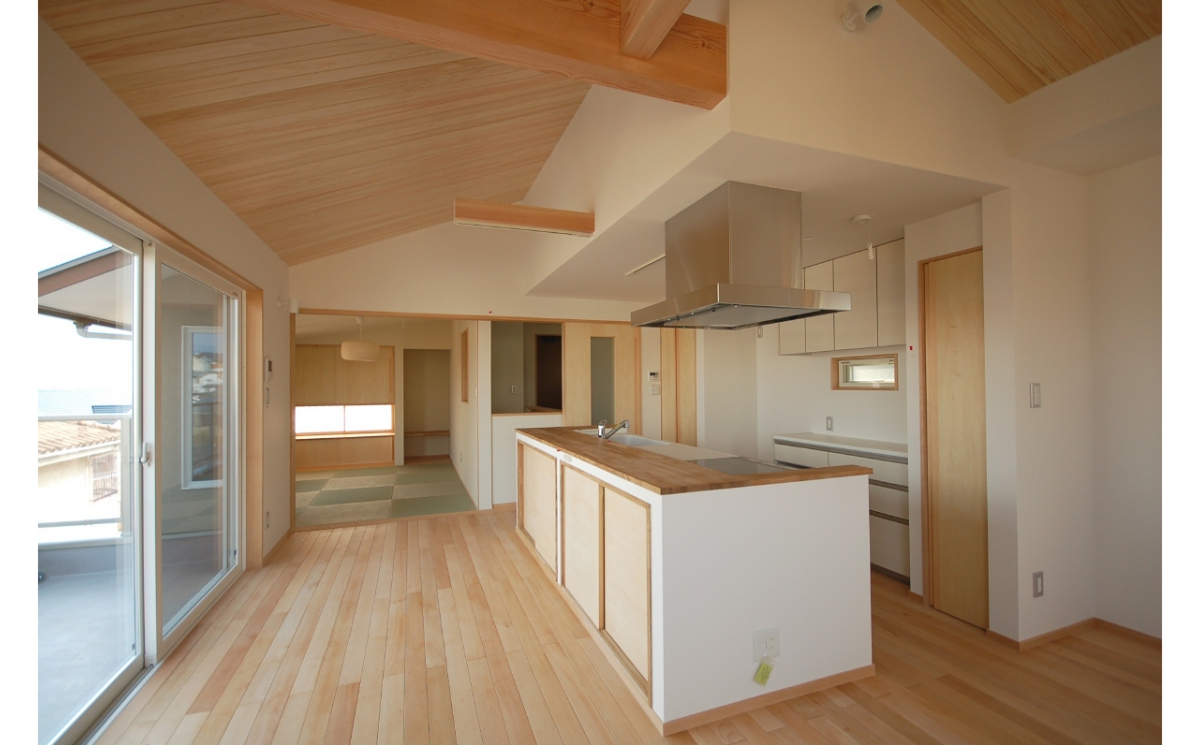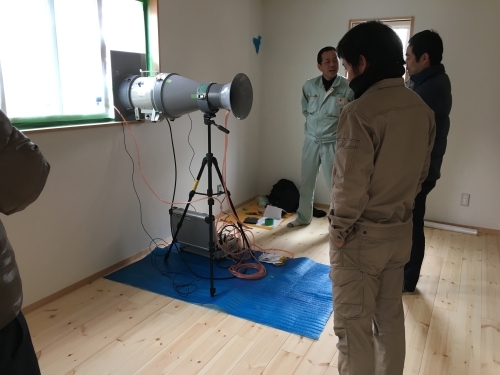 気密は、部屋内側の壁にビニールフィルムを貼る気密では無く、外部に貼る透湿面材にて気密を取る方法を採用致しました。これにより調湿と気密を両立した建物となっております。